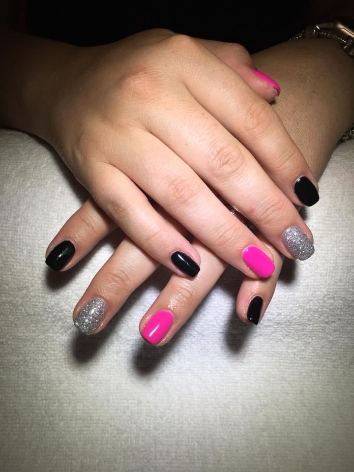 potažení vlastních nehtů gelem nebo s prodloužení pomocí tipů (gely značky Tasha) Fancouzskou modeláž děláme pomocí gelu. Na barevné používáme gellaky značky Enni nails. Dozdobit je možné vodolepkami a třpytkami.